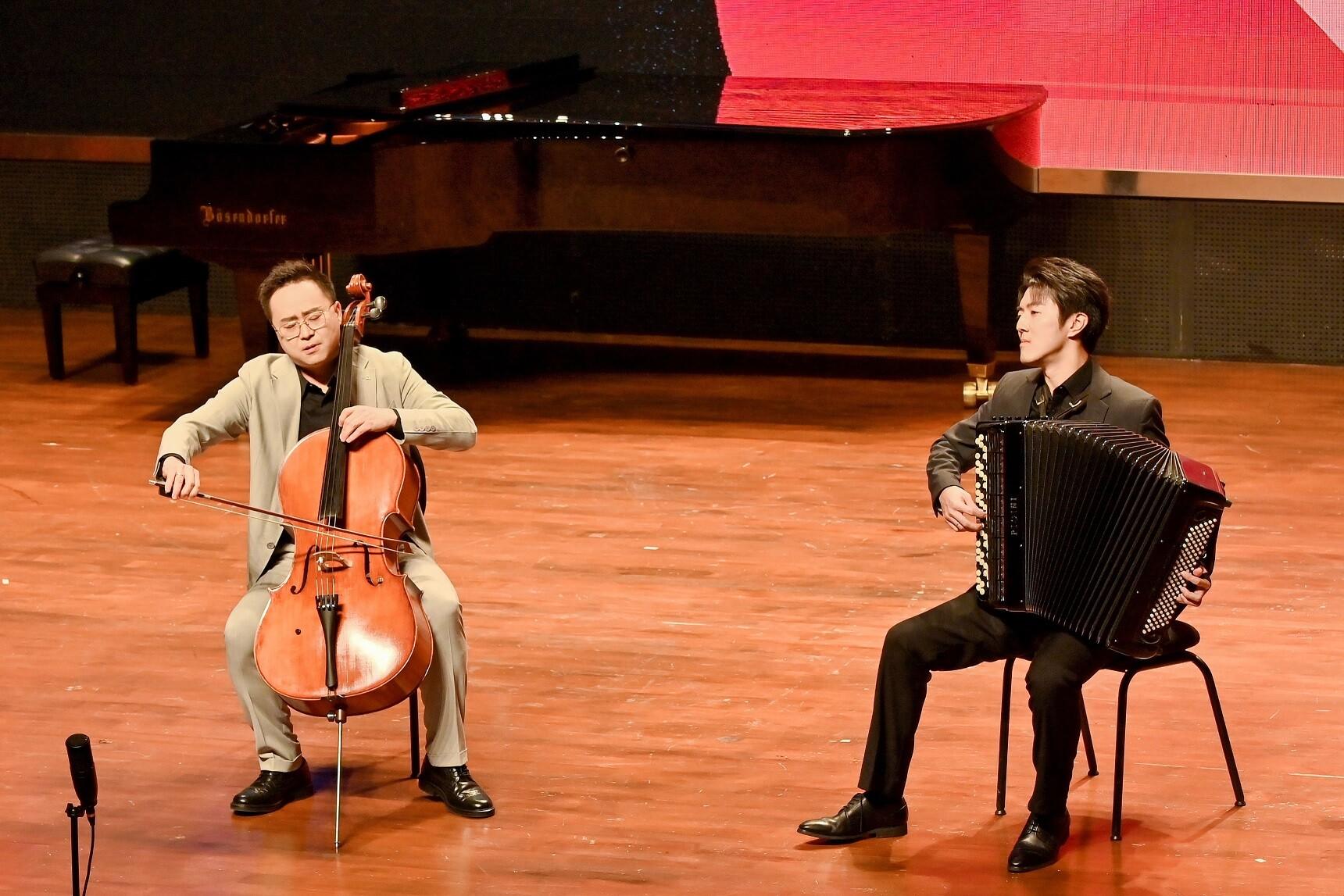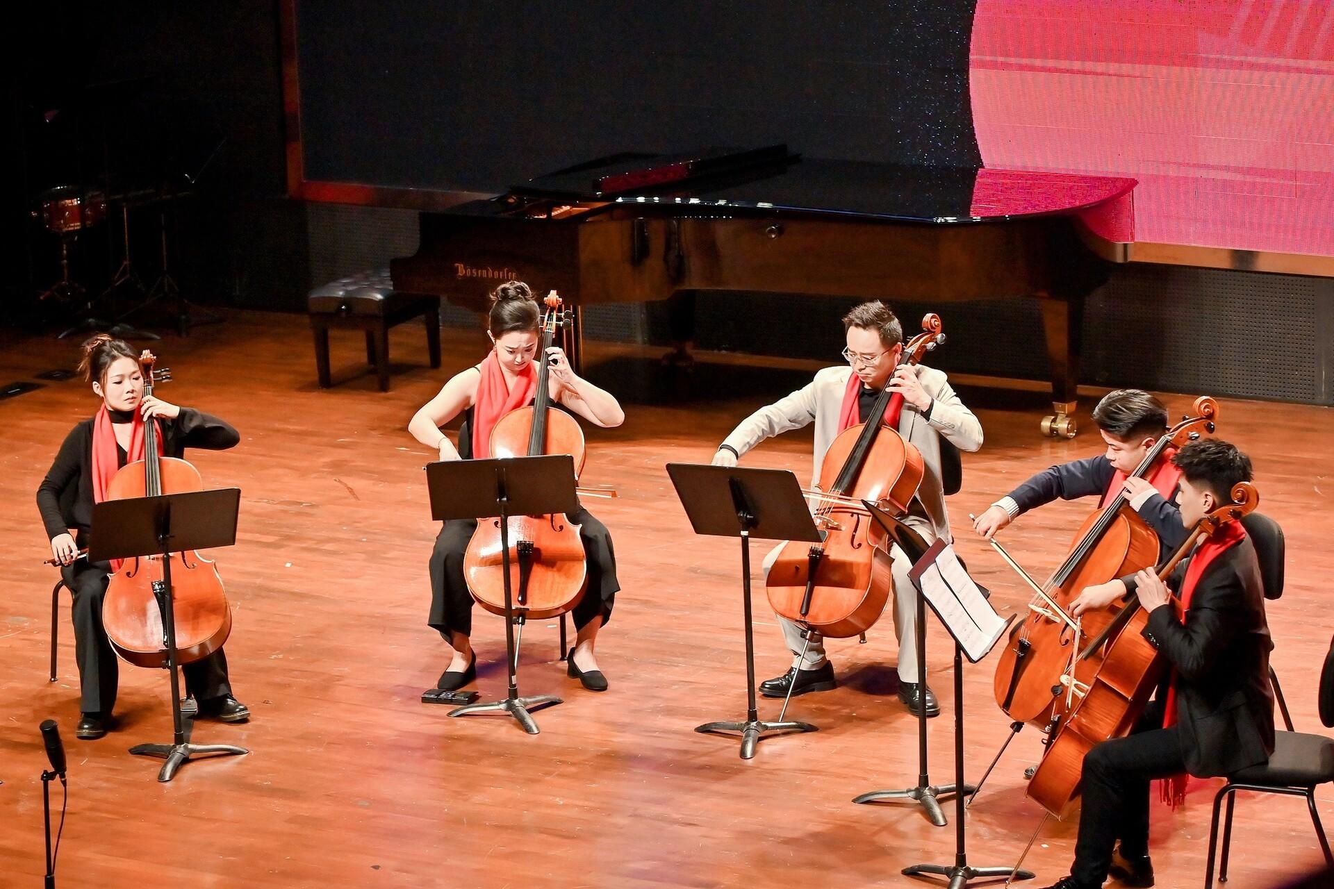 这场以“跨越时空、融汇东西”为主题的音乐盛宴中,《灯塔》与《葬花吟》两首特色节目也成为了全场亮点。《灯塔》是一首由年轻作曲家吴泽华创作的大提琴五重奏作品,其旋律中蕴含着浓厚的东方韵味,大气磅礴,仿佛一座灯塔在黑夜中指引方向,给人以无限的希望与力量。陈果教授作为主奏大提琴家,与四位学生共同完成了这首作品的演绎。“为了这次演出,我们提前两个月就开始准备,每天排练,追求每一个细节的完美。”湖南师范大学音乐学院研究生景美怡然在演奏中负责和声部分,她表示此次能和老师们同台演出,是一次非常宝贵的学习机会。