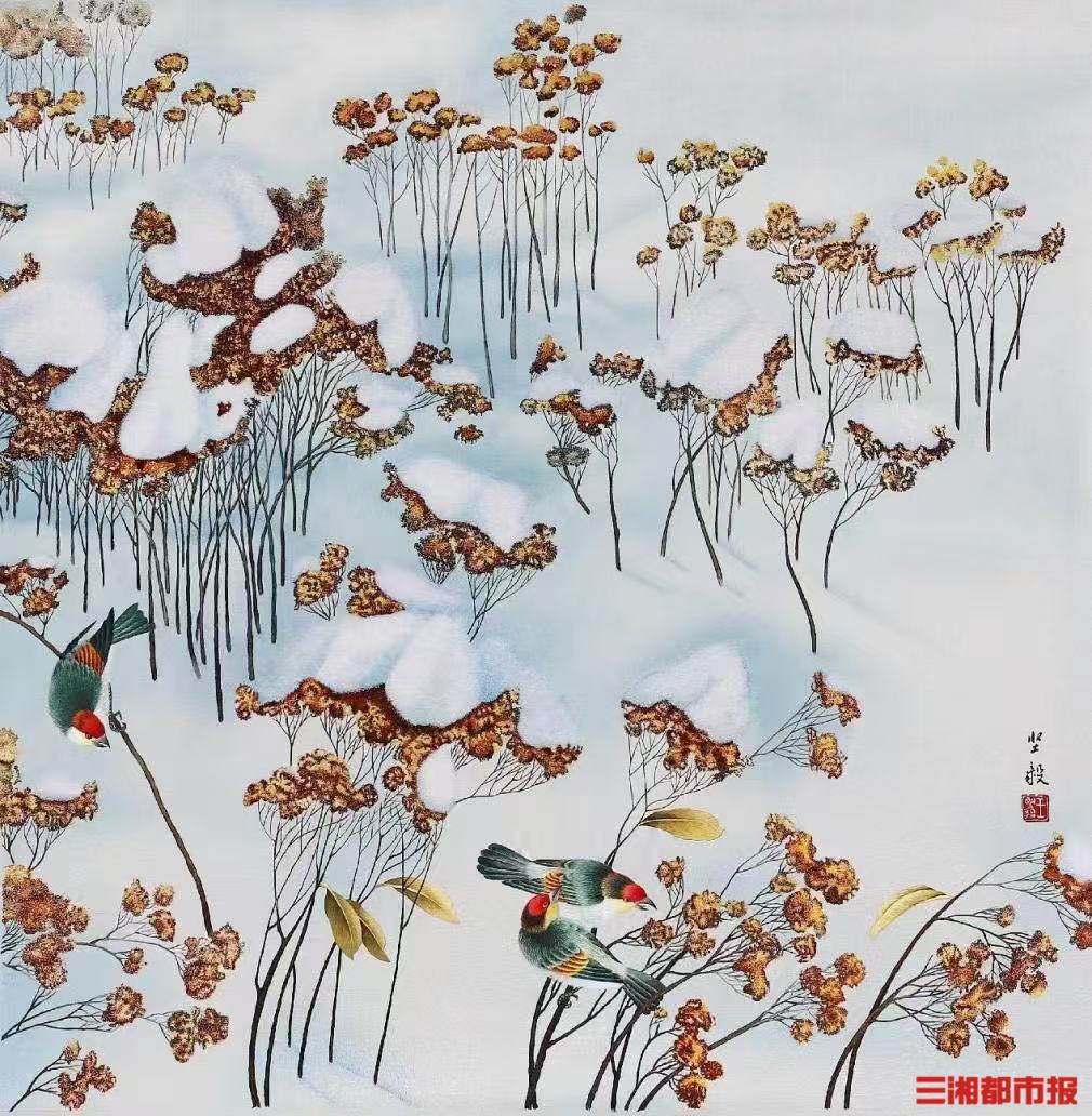 在作品《雪霁》中,她曾冒险尝试新的针法。为了一个效果,反复试验了大半年,才最终定型,创新出“雪籽绣”“绒毛打籽绣”的纯手工技法,打破了传统的乱针绣。
