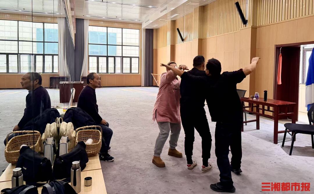 排练室里戏腔悠扬。12月21日,长沙市花鼓戏保护传承中心的排练厅内,三名花鼓戏演员面对着舞蹈镜,为一个起手动作反复试着不同的节奏。手抬高了一点,他们停下;脚步快了半拍,他们退回原位……没有观众,也没有掌声。反复推翻的,是一个没有到位的动作。