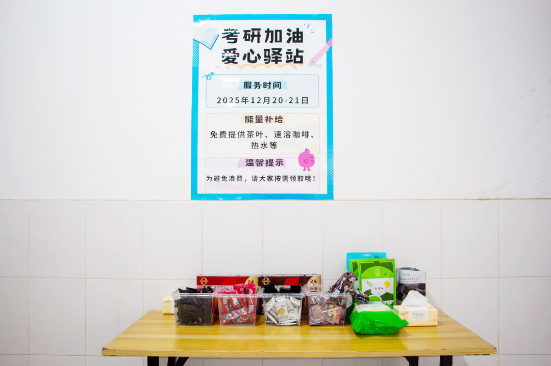 学校的护航,细致到了每一个可能的需求。各考栋均配备了值班医生,常备药品与口罩随时可及,以应对健康突发状况。设置在楼内外的6个“加油爱心驿站”,则持续供应着免费咖啡等热饮和能量零食,为考生驱寒提神,补充体力。