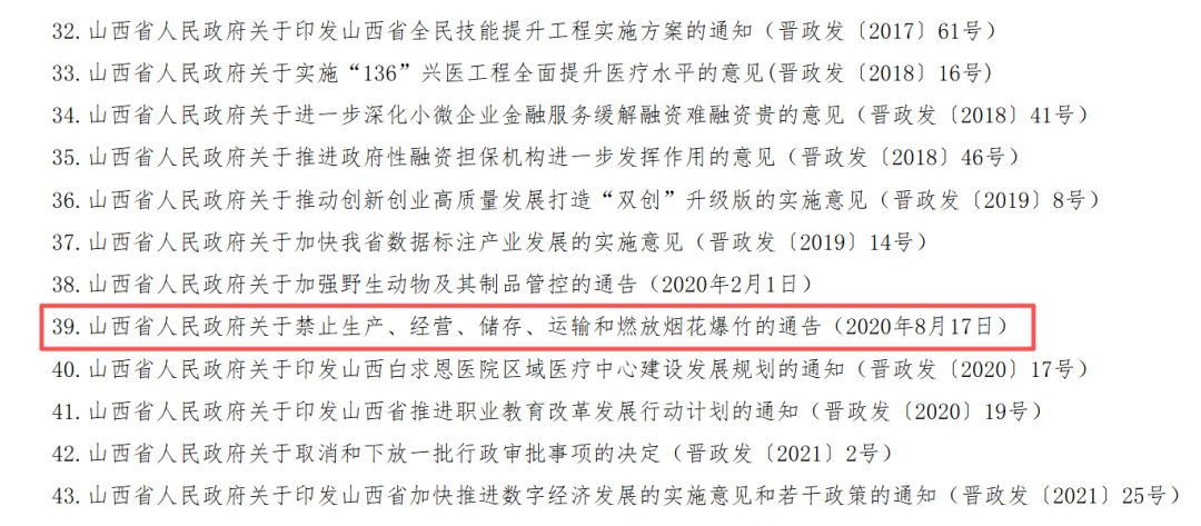 在公布的文件目录中,2020年8月17日发布的《山西省关于禁止生产、经营、储存、运输和燃放烟花爆竹的通告》也被宣布废止。