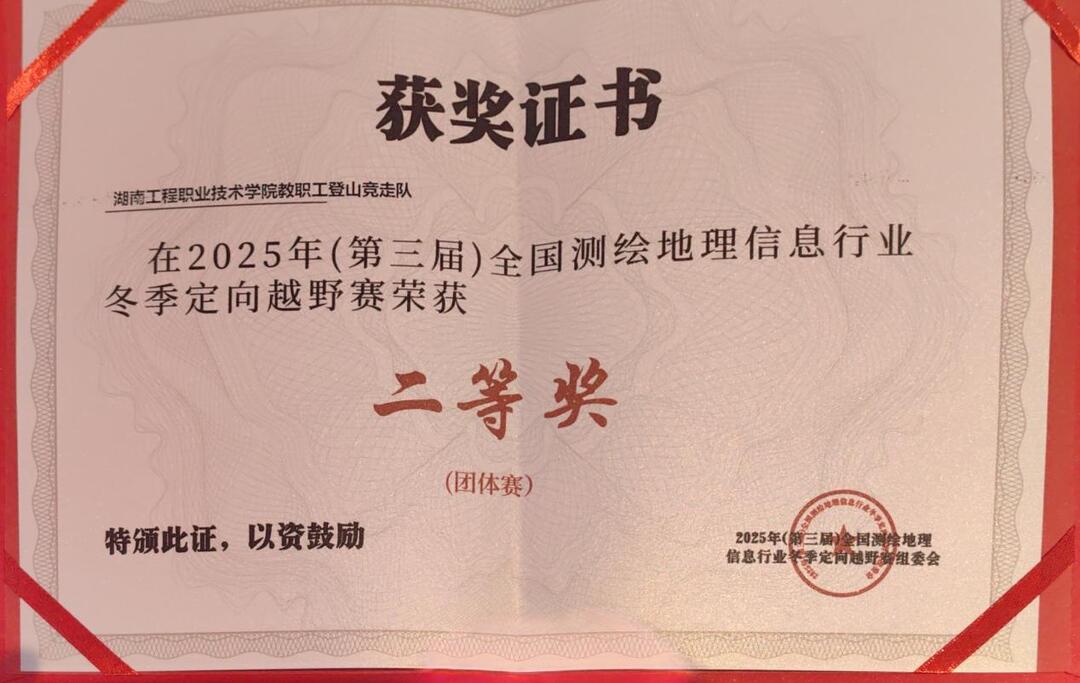 湖南日报12月21日讯(通讯员 李勇)12月16日-19日,2025年(第三届)全国测绘地理信息行业冬季定向越野赛在海口举办。湖南工程职业技术学院教职工竞走队斩获多项荣誉:学校教职工竞走队斩获团体二等奖,运动员易歆获个人赛青年女子组一等奖(全国第七名),运动员查道函、马泳成分获个人赛成年男子组二等奖,运动员袁靖获个人赛青年男子组二等奖,运动员黄琼获个人赛青年女子组三等奖。