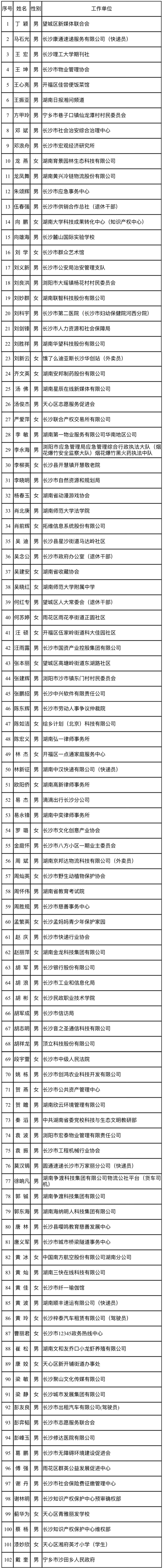 记者21日从长沙市委社会工作部获悉,长沙市人民建议征集特邀建议人拟聘用人选名单正对外进行公示,全市共有102名来自社会各界的人选入围。这份名单涵盖代表委员、新就业群体、行业协会负责人等多个领域,凝聚起社会各界的智慧力量,搭建民意直通决策的桥梁,为长沙特大城市治理注入新活力。