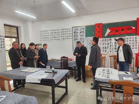 湘乡市文联主席成惠林、市书法家协会主席傅炜等领导亦与会交流。在校方陪同下,众人参观了书法练习室与校史馆,对学校深厚的百年办学历程进行了深入了解。