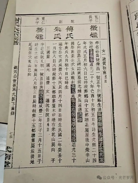 为了验证这一说法,笔者随后查阅了修于民国八年(1919年)的《谢氏大宗族谱》。其中明确记载:“谢崧岱配傅氏,国学雨严公次女,清敕封孺人。充县立高等女子学校校长。道光三十年(1850年)庚戌九月初十日巳时生。”