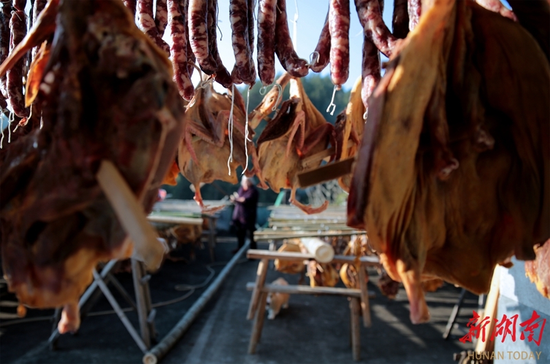 12月21日,桂东县沤江镇坪水村,村民在晾晒腊味制品。冬至节气,该县各地村民纷纷晒制腊肉、腊肠等传统腊味制品,腊味飘香。邓仁湘 摄(湖南图片库)