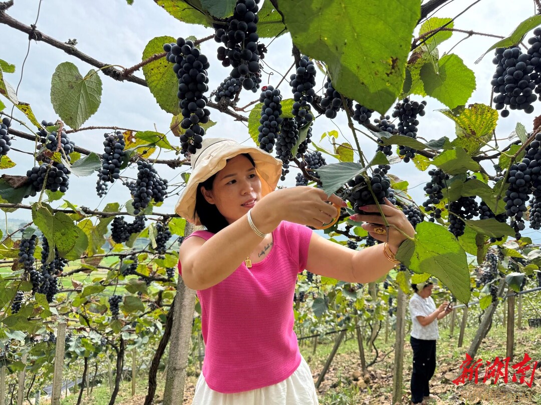 游客在上江圩镇甘益村的高山刺葡萄种植基地体验采摘乐