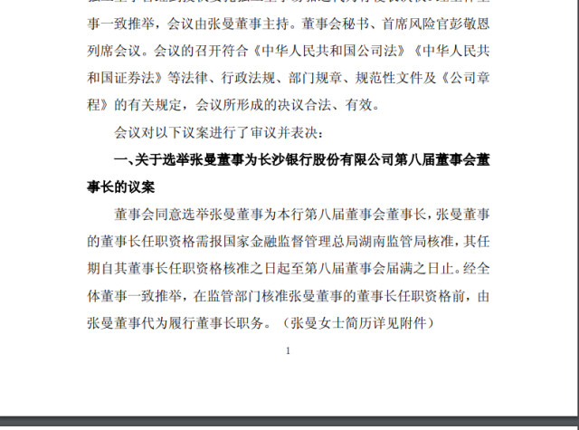 湖南日报12月22日讯(全媒体记者 黄炜信)长沙银行近日发布第八届董事会第四次临时会议决议公告,会议审议通过了《关于选举张曼董事为长沙银行股份有限公司第八届董事会董事长的议案》,董事会同意选举张曼董事为该行第八届董事会董事长。