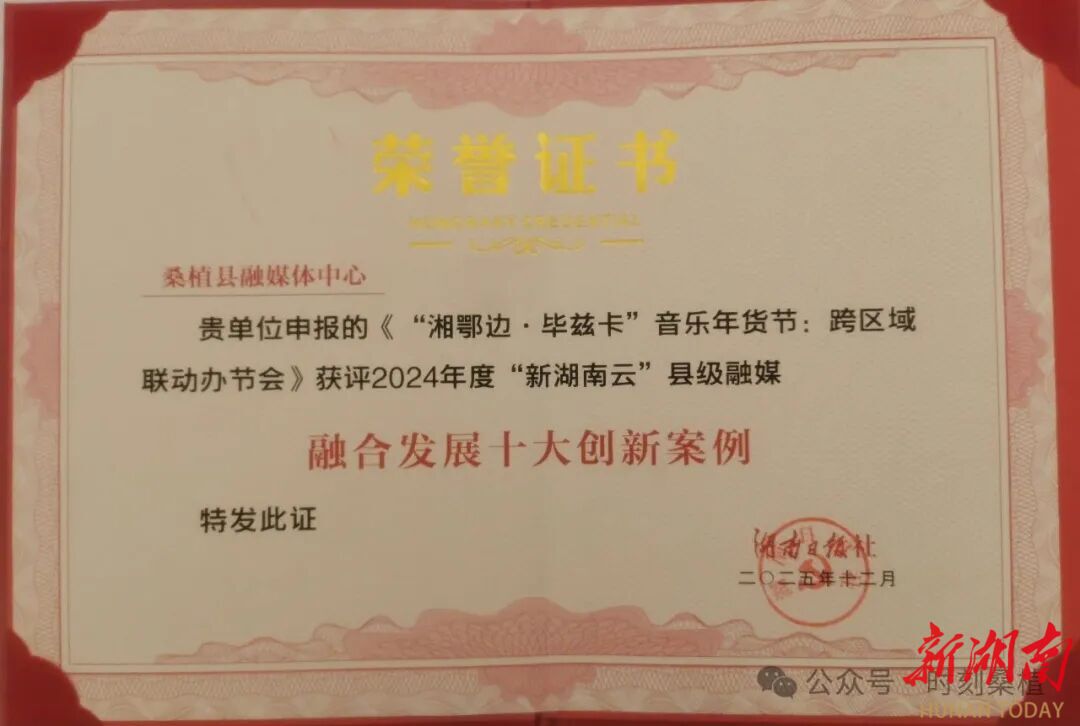 湖南日报·新湖南客户端12月22日讯(通讯员 张芬)12月18日,2024年“新湖南云”县级融媒融合发展成果评选发布会在祁阳市举行,桑植县融媒体中心报送的《“湘鄂边·毕兹卡”音乐年货节:跨区域联动办节会》案例获评2024年度“新湖南云”县级融媒融合发展十大创新案例。