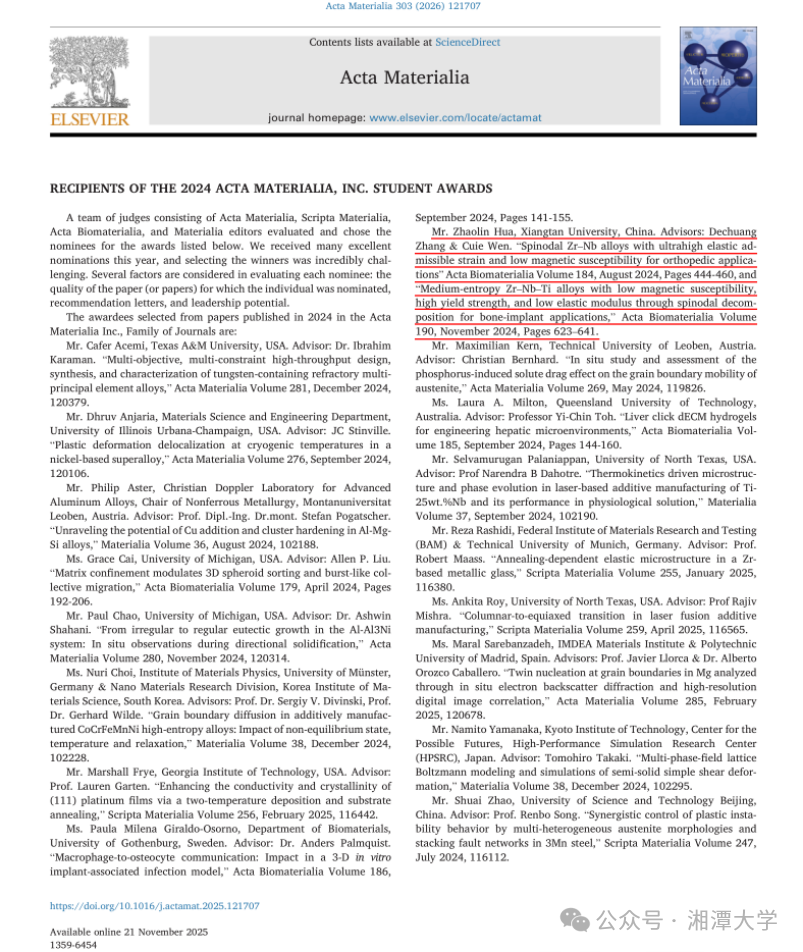 基于相关研究成果,花照林以第一作者身份在《Acta Biomaterialia》连续发表4篇高水平学术论文,为医用金属材料的性能优化提供了全新的理论视角与技术路径。如今,花照林已受邀参加2026年3月在美国圣地亚哥举行的美国矿物、金属与材料学会(TMS)学术年会,将与全球学术精英分享这一研究成果。