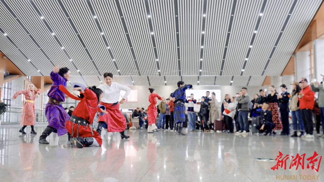 在张家界西站站前广场及候车大厅内,明快的鼓点突然响起。身着民族特色服饰与蒙古草原盛装的演职人员们默契登场,将《茶马雄风》的豪情融入舞蹈,灵动的舞步、飞扬的衣袂瞬间点燃现场氛围。演员们精湛的表演让旅客们纷纷驻足,手机镜头纷纷对准这片流动的“舞台”。随后,荷花国际机场停车场前,伴随着悠扬的民族音乐,演员们随歌舞动,此刻草原的豪情,在迸发!土家的血性,在燃烧。长张高速武陵源出口,极具冲击力的群舞表演更是吸引了过往自驾游客驻足观赏,不少车主停车打卡,感受这份旅途的惊喜。