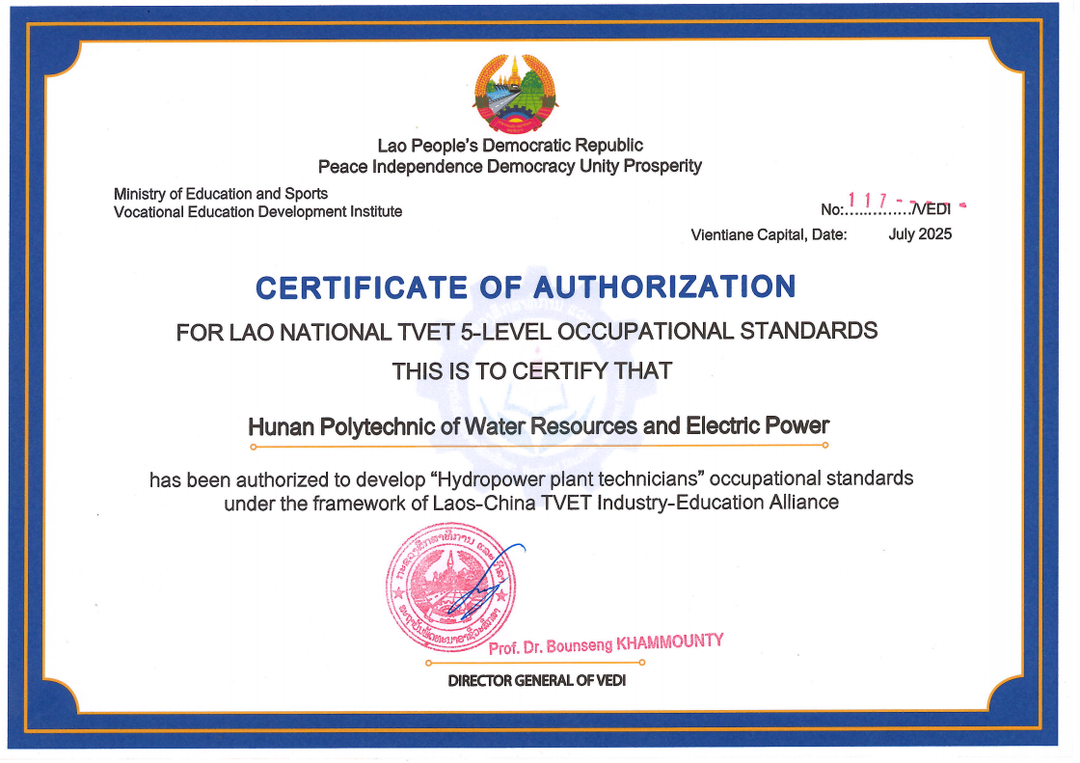 该项目经层层遴选,最终全国仅有6所院校获批。湖南水电职院凭借其在水电领域的专业实力与国际化合作经验成功入选。项目完成后,“水电站技术员”职业标准将被纳入老挝国家资历框架体系,成为老挝水电行业技能人才培养与评价的重要依据,助力该国职业教育体系规范化与产业升级。