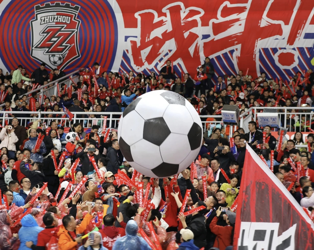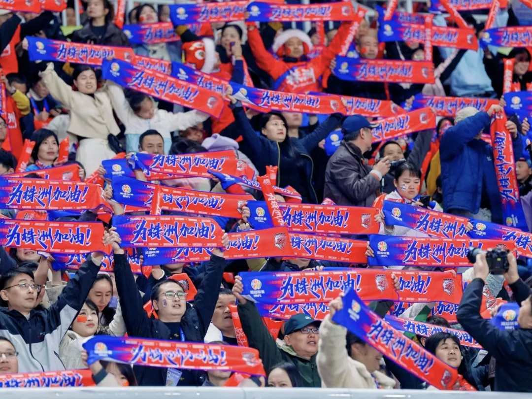 在株洲主场,足球巨型标识、炎帝形象TIFO、4万名球迷组成的“红色海洋”震撼人心,助威围巾、文创产品都融入工业元素与神农文化,每一处设计都刻着城市印记。