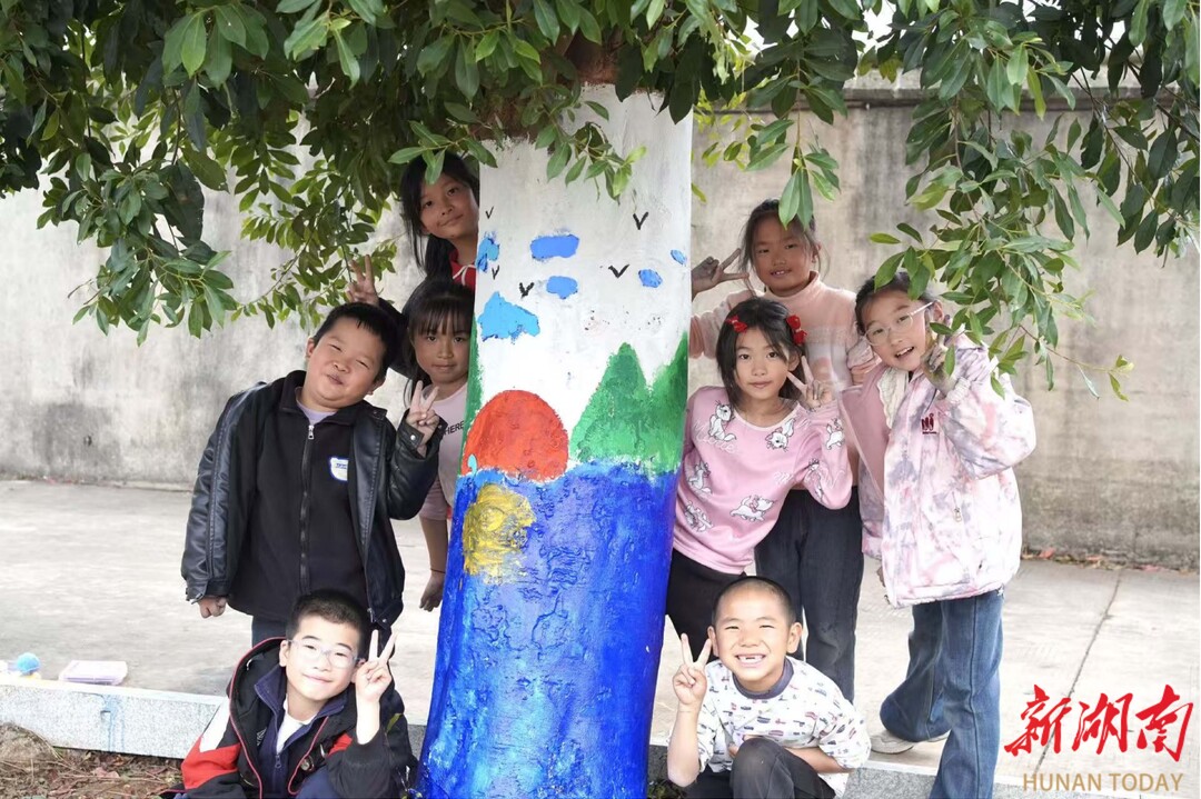 操场上的集体创作区更是热火朝天分年级的创意实践让艺术融入乡土与生活。二年级的小画家们为光滑的石头穿上斑斓 “彩衣”,动物、风景、卡通形象跃然石上;三年级的“大树美容师”为树干穿上了花花新衣;四年级的巨幅四季幕布铺展出孩子们对家乡春夏秋冬的观察;五年级学生创作的横幅笔走龙蛇,寓意美好;六年级的环保稻草人造型各异,憨态可掬。每一处,都能看到小艺术家们专注的神情和协作的身影。