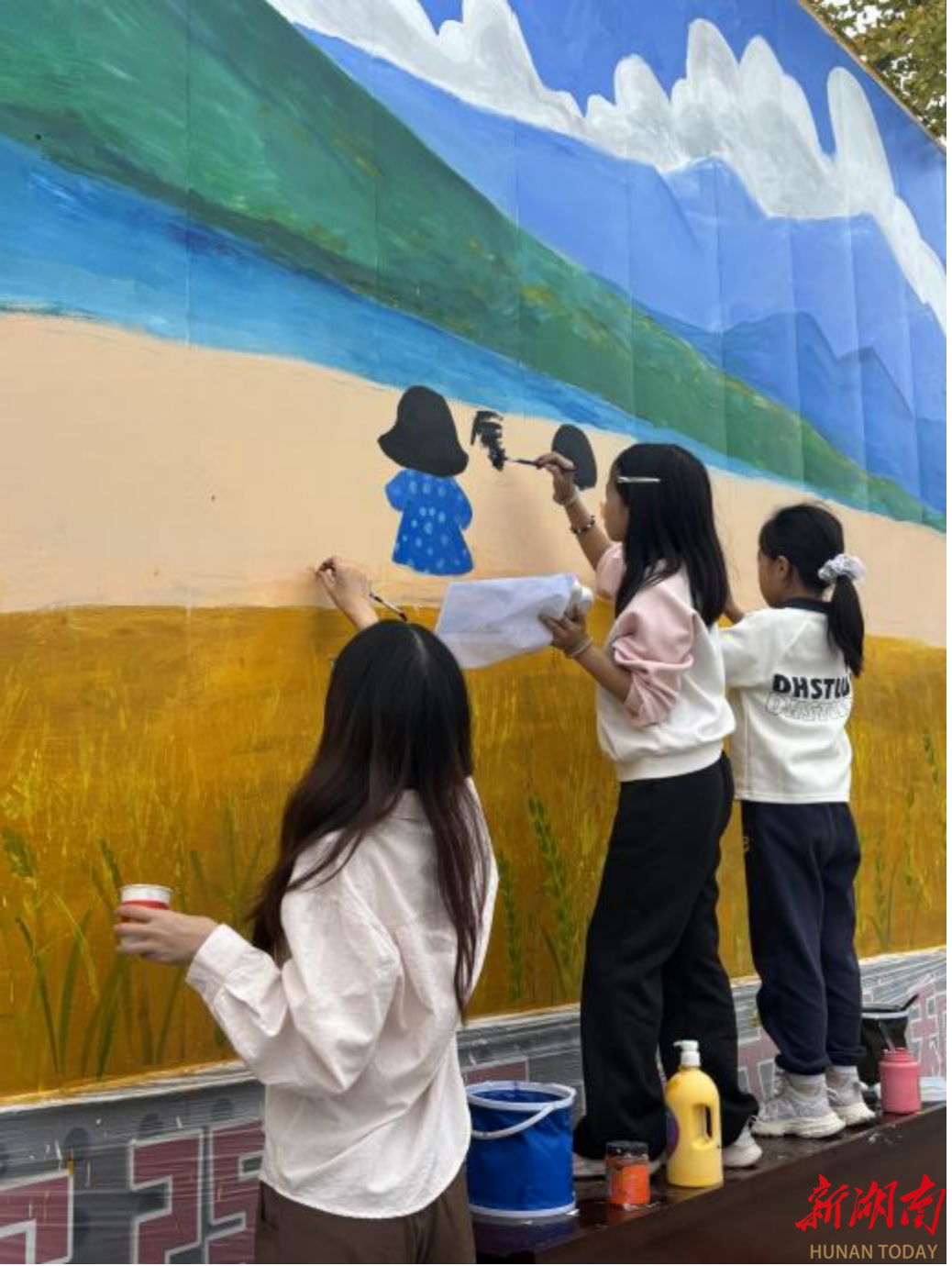 这场“田野里的艺术梦”从一面白墙的蜕变开始。校园入口处,原本素净的白墙是全校师生的共创画布。在“路口镇山水田园”的主题征集下,三位同学的鲜活设计入选,师生一起打稿、调色、绘制,孩子们更是别出心裁,剪下田野里的真实稻穗,蘸上黄橙颜料粘贴出田野肌理,让金黄的“田野”触手可及。仅用两天时间,这幅凝聚了“扎根乡土、师生同心”集体巧思的壁画成为了艺术节最生动的序章。