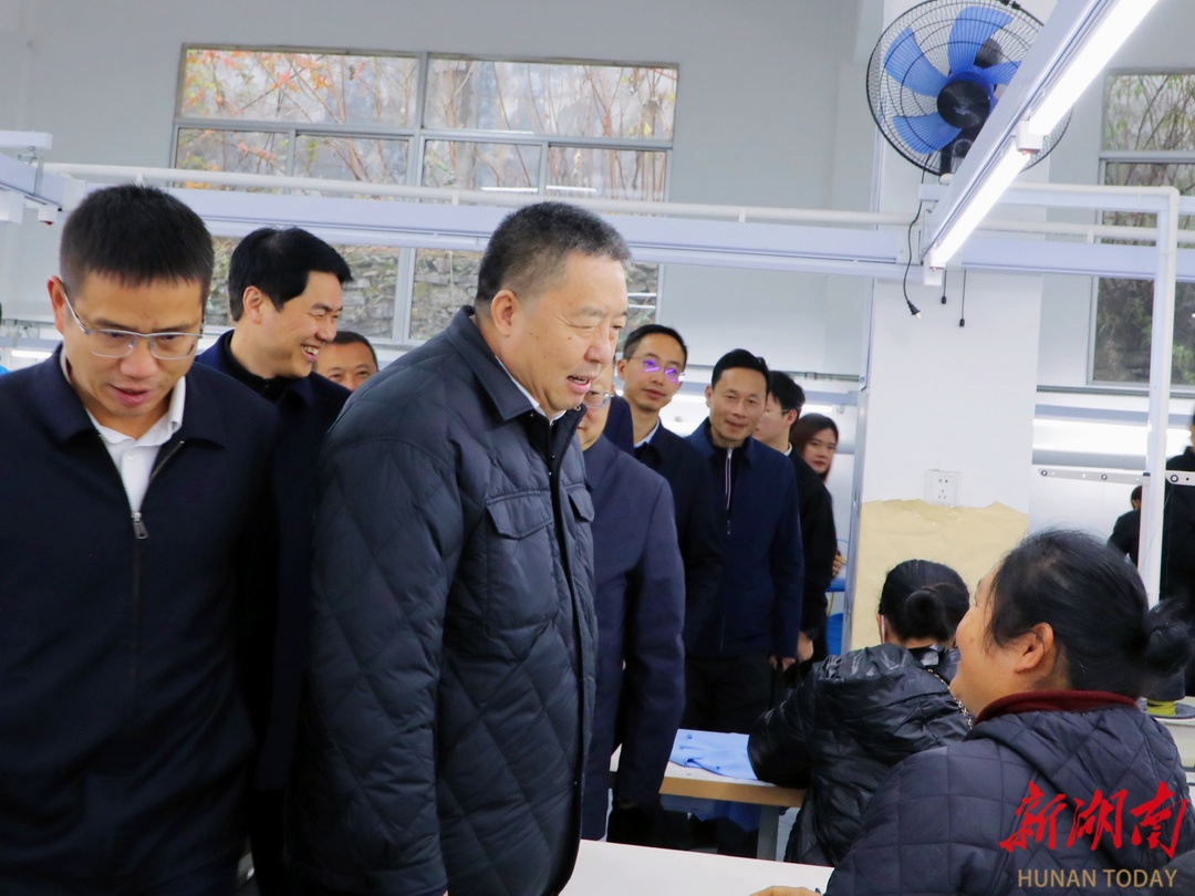 (12月21日,省政协主席毛万春率队在湘西土家族苗族自治州花垣县宣讲调研。图为毛万春在十八洞片区服装厂调研。)