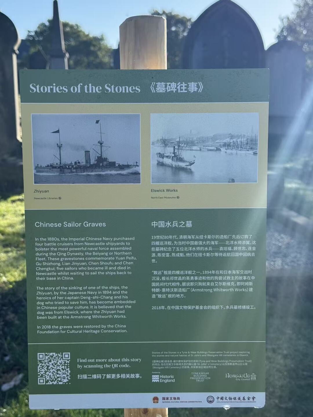 纽卡斯尔市位于英格兰东北部,曾与中国近代海军的早期探索紧紧相连。19世纪中后期,清王朝的海防危机如乌云压境,这座以造船业和钢铁产业闻名的英国北方港口重镇,成了遥远东方的希望之地。1874年的“超勇”“扬威”、1887年的“致远”“靖远”——这些当时世界顶尖的铁甲战舰,从这里的钢铁熔炉里驶出,成为北洋水师的脊梁。而鲜为人知的是,在邓世昌率部赴英接收军舰、训练期间,有六位随军士兵因水土不服突发疾病客死他乡,永远长眠在当地的圣约翰墓地。百年风雨侵蚀,坟茔渐次荒芜,直到2016年,当地留学生偶然的脚步踏过杂草丛生的小径,才唤醒了这段沉睡的记忆。2018年,在驻英领馆与当地华人华侨的共同努力下,墓碑终于重新修缮挺立,刻着“大清故勇”的汉字在英伦的阳光下, 像一束穿越时空的光。
