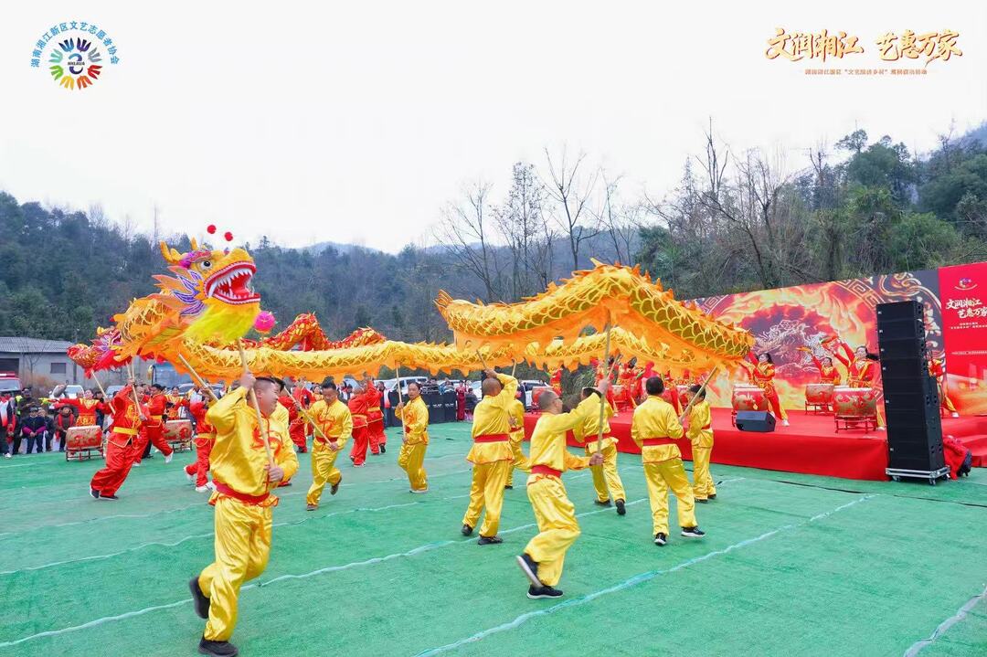 湖南日报·新湖南客户端12月22日讯(通讯员 肖乐之)冬日暖阳映碧水,龙唐村里话丰年。今天上午,湖南湘江新区白箬铺镇龙唐村锣鼓喧天、龙腾虎跃,“文润湘江 艺惠万家”湖南湘江新区文艺赋美乡村巡回演出在此举行,13个精彩的文艺节目表演及送春联活动吸引了近千名村民到场观看。