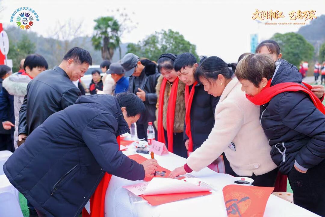 活动现场,舞台旁设有“新春翰墨·福韵湘江”送春联区域。来自长沙老干部文学艺术联合会的谢胜文等6位书法家铺纸挥毫,将一副副寓意吉祥的春联送到村民手中,为即将到来的新春增添浓浓年味。此外,活动中还举行了文艺志愿者证书颁发仪式,表彰长期扎根基层的文化服务工作者。