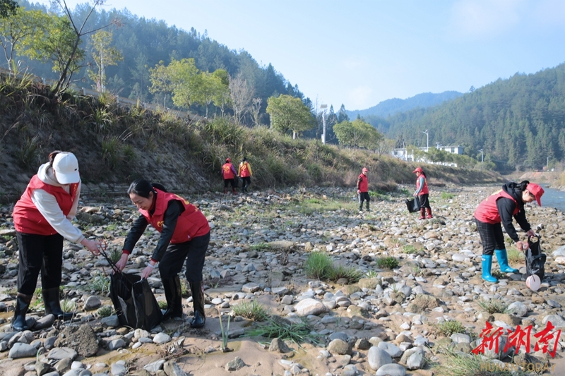 12月22日,桂东县沤江镇增口村,桂东县星火志愿者协会的志愿者们在沤江河滩拾捡白色垃圾。连日来,该协会在沤江重点河段开展净滩行动,用志愿力量守护生态环境。邓仁湘 摄(湖南图片库)