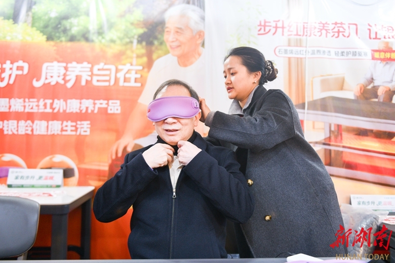 12月22日,市民在体验护眼产品。连日来,娄底市第二届“银发经济消费月”活动在娄星区孙水公园举行,通过五大主题展区,全方位展示新产品和新技术,涵盖养老、医疗、消费等多个领域。活动旨在促进银发经济发展,提升银发消费水平,助力老年友好城市建设。吴永华 摄(湖南图片库)