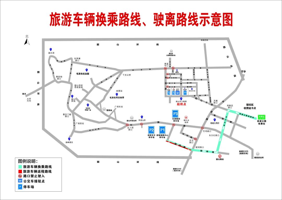 1、高速方向旅游车辆:一律经东方红路、如意路转韶润路进入游客换乘中心停车场(1号停车场)停放,换乘旅游环保车进入韶山景区。返回时,经韶润路驶离。