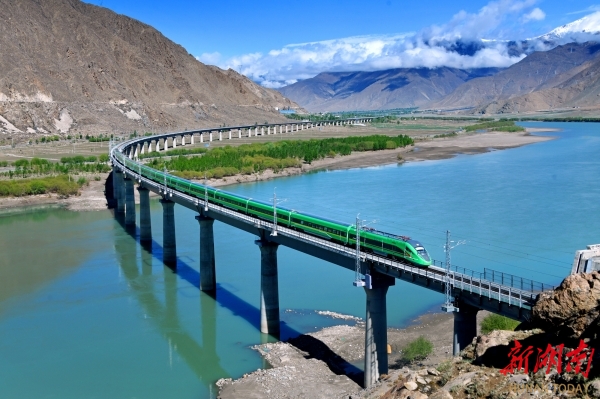由中国国家铁路集团有限公司统筹,中车株机公司等单位联合研制的复兴号高原内电双源动车组,傍行在雅鲁藏布江峡谷。罗春晓 摄