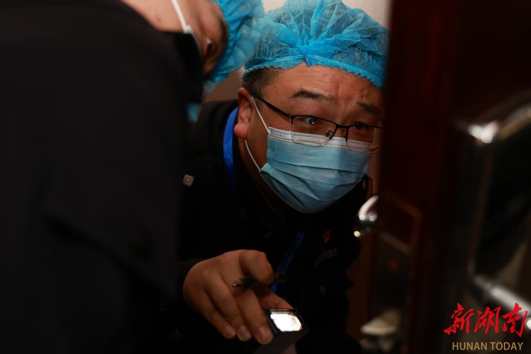 持续亮剑严打违法犯罪,全力守护群众生命财产安全。图为湘潭市公安局刑事技术民警细致勘查现场。(雷柯 摄)