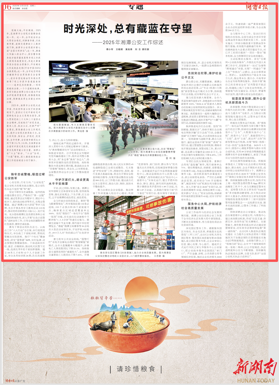 莲城大地,平安潮涌。2025年,是湘潭市公安机关铿锵奋进的一年。这一年,全市政治社会大局安全稳定,刑事案件数、行政案件数、道路交通事故亡人数持续下降,湘潭市公安局获评第七届“全国文明单位”;这一年,禁毒工作融入综治中心、园区警务服务经济高质量发展等多项工作获上级领导高度肯定,多起大要案件侦办经验全国推介,平安建设工作成效在央视《平安中国2025》全面展现;这一年,全市电信网络诈骗案件打击质效排名全省第一,老旧非营运柴油货车淘汰更新等7项工作获市委通报表扬……一连串扎实的数据、一项项突破的业绩、一个个温暖的故事,共同勾勒出湘潭公安以高水平安全护航高质量发展、助推高效能治理、保障高品质生活最生动的注脚。