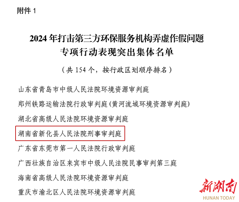日前,生态环境部、最高人民法院、最高人民检察院、公安部、市场监管总局对2024年度打击第三方环保服务机构弄虚作假问题专项行动中表现突出的集体和个人通报表扬。其中,新化县人民法院刑事审判庭成功入选表现突出集体名单,荣获打击第三方环保服务机构弄虚作假问题专项行动表现突出集体!
