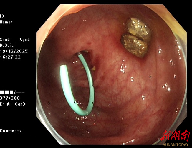 手术全程在肠镜引导下精准推进,肠镜经肛门结肠,直达阑尾开口部位,内镜子镜顺利插入阑尾腔,直视下见阑尾黏膜充血水肿,腔内有一粪石嵌段,子镜直视下用取石网篮将嵌顿结石顺利取出,充分冲洗阑尾腔后,再置入阑尾内单猪尾支架充分引流。术后,小张恢复良好,当天即可下床活动并进食流质食物,3天后康复出院。