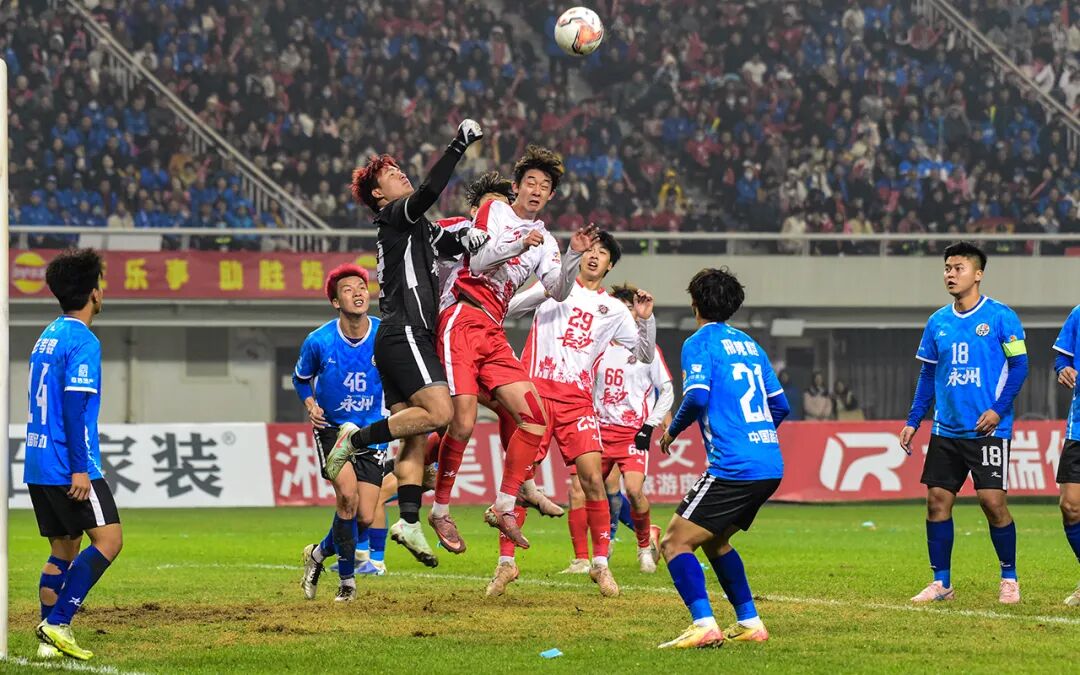 和专注你死我活的世界杯相比,湘超氤氲着超脱胜负之外的城市情谊。长沙vs永州半决赛赛前,省会长沙街头的许多大屏幕上,出现了“欢迎永州”的巨幅广告,这可能是足球史上最隆重最崇高的对客队的欢迎式。永州逆袭战胜长沙后,身着蓝色球衣的永州队员们携手来到长沙球迷的看台,一起鞠躬致谢:“感谢长沙”,看台上穿着红色球迷服的长沙球迷则回以“湖南加油”的嘶吼。而株洲VS常德的赛后,也上演了一幕温馨的画面——虽然株洲队点球告负,但看台上的主队球迷仍然毫不吝啬地喊出“祝贺常德”,这一刻看台上下彼此交融,赛场内外相映成辉,共同构建出一幅独属于湖南足球的美丽风景。