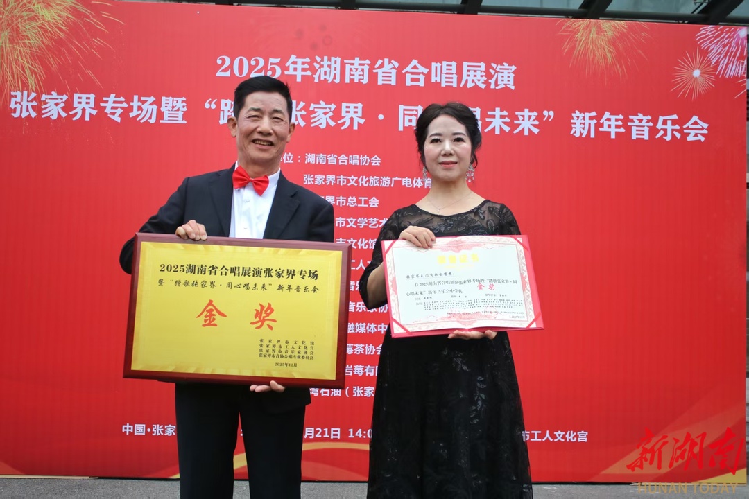 湖南日报·新湖南客户端12月23日讯 (通讯员 黄立功 张意慧)12月21日下午,“2025年湖南省合唱展演张家界专场暨‘踏歌张家界·同心唱未来’新年音乐会”在张家界市工人文化宫圆满落幕。张家界天门飞歌合唱团凭借出色的演唱征服现场评委与观众,荣获金奖。这是该合唱团继2023年首届湖南省合唱展演张家界专场摘金后,再次获此殊荣,既是对团队专业艺术水准的高度认可,更是张家界群众文化事业蓬勃发展的鲜活见证。