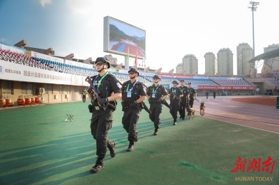 “湘超”联赛湘潭主场6战,交出“零事故”平安答卷。图为湘潭市公安局民辅警携带警犬在“湘超”赛场内开展搜爆安检工作。湖南法治报通讯员 雷柯 摄