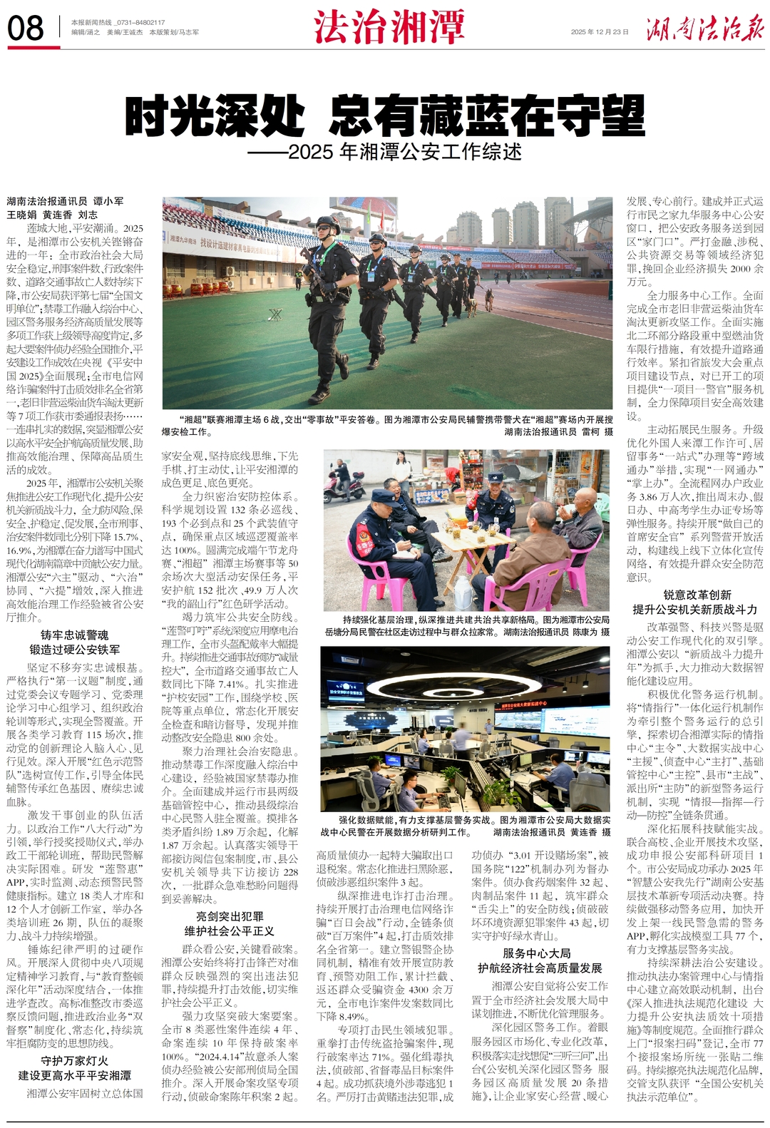 莲城大地,平安潮涌。2025年,是湘潭市公安机关铿锵奋进的一年:全市政治社会大局安全稳定,刑事案件数、行政案件数、道路交通事故亡人数持续下降,市公安局获评第七届“全国文明单位”;禁毒工作融入综治中心、园区警务服务经济高质量发展等多项工作获上级领导高度肯定,多起大要案件侦办经验全国推介,平安建设工作成效在央视《平安中国2025》全面展现;全市电信网络诈骗案件打击质效排名全省第一,老旧非营运柴油货车淘汰更新等7项工作获市委通报表扬……一连串扎实的数据,突显湘潭公安以高水平安全护航高质量发展、助推高效能治理、保障高品质生活的成效。