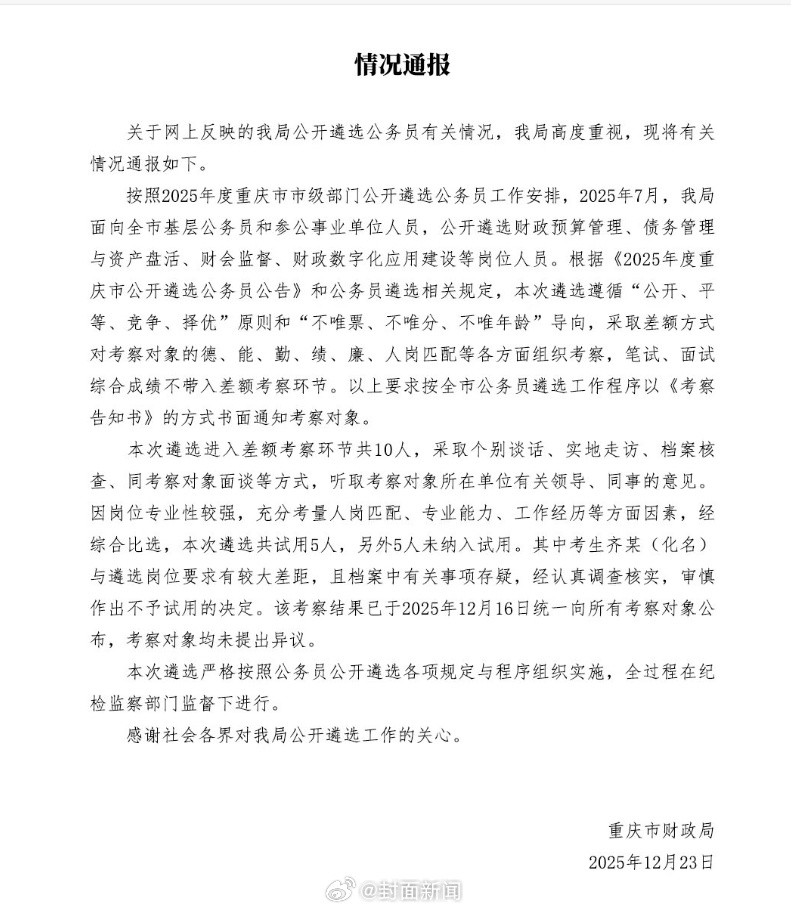 记者检索发现,12月16日,重庆市财政局公示“2025年度公开遴选公务员拟试用人员名单”中,没有齐挺的名字,公示时间自12月17日至12月23日。