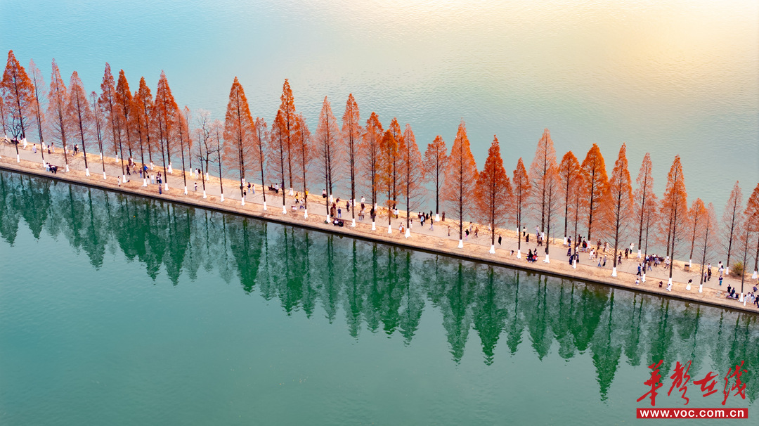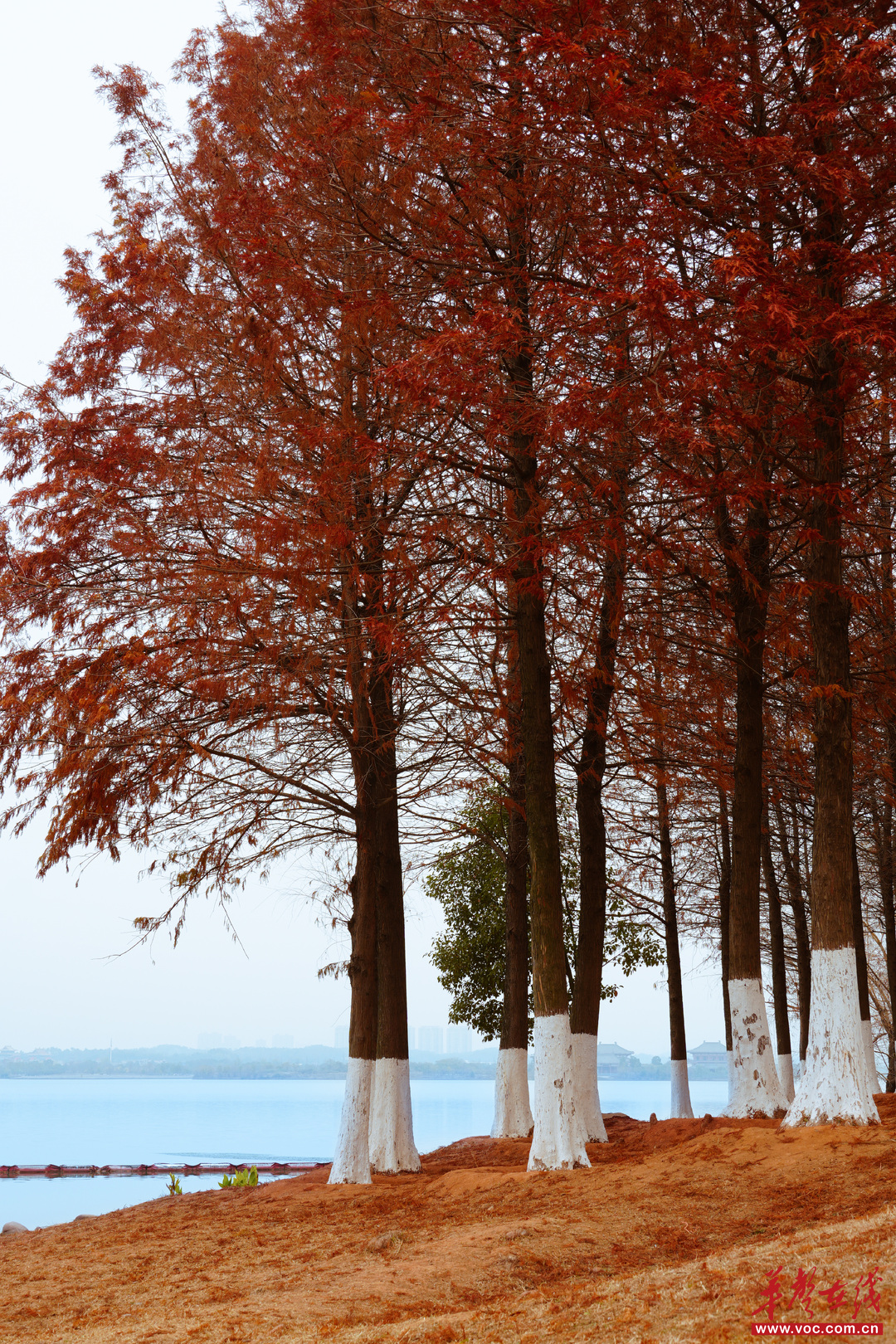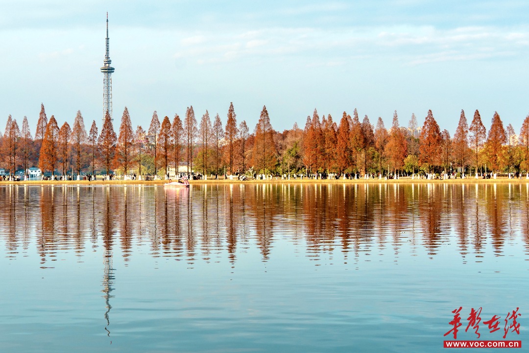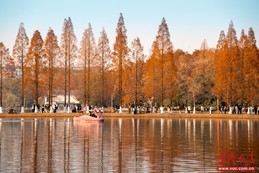 从地铁烈士公园站2A口出来,由南门进入公园,沿林荫道行至烈士塔右转,年嘉湖便映入眼帘。远远望去,水中央那一线挺拔的水杉林自成一景,承载着无数长沙人的秋冬记忆。
