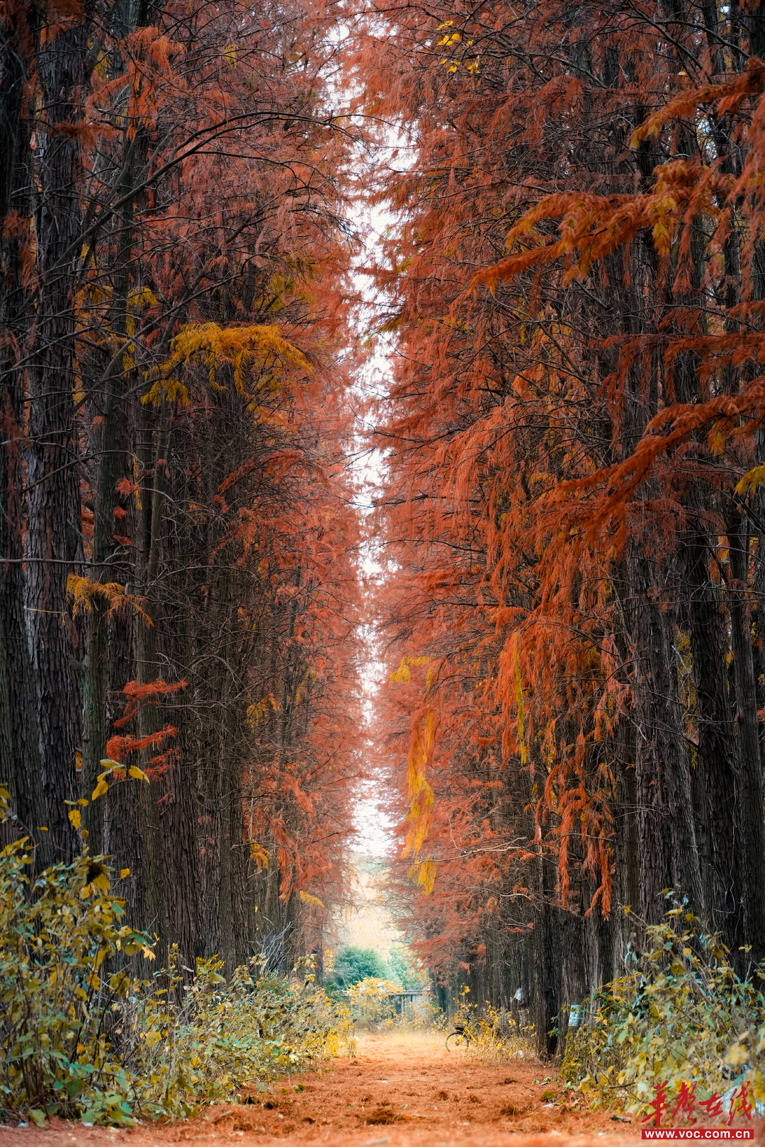 右侧林,笔直参天的水杉整齐列队,一条水泥路穿行其中。驾车驶过,如同闯入一条遮天蔽日的红色隧道。