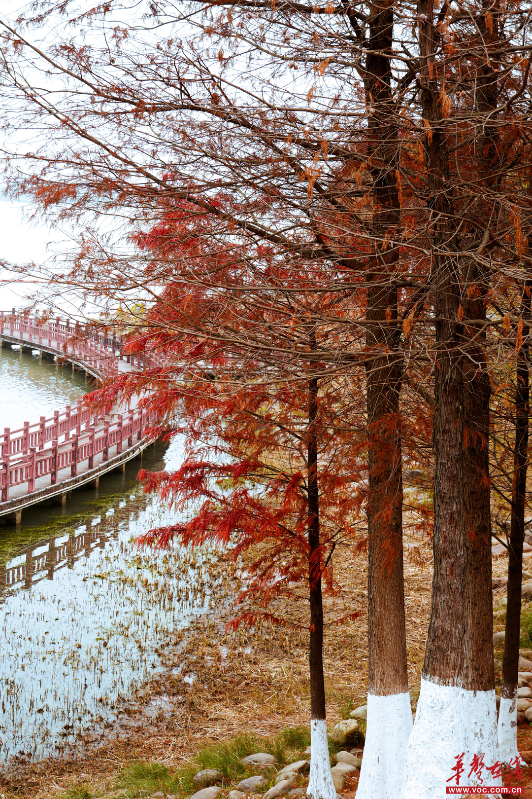 这里,是感受湿地生态之美的绝佳去处。大面积的水杉临水而生,形成一片水上森林。游客可以走进林中,以漫天橙黄为背景留影;可以登上廊桥,看层林尽染的画卷;也可以静静坐在水边石上,看树影、倒影与光影交织,独享属于冬日的浪漫。