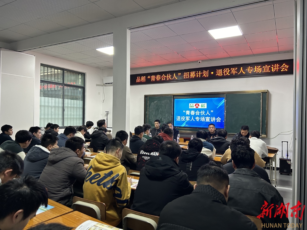湖南日报·新湖南客户端12月23日讯(聂沛 张子欣) 为拓宽退役军人就业创业渠道,引导优秀退役军人积极投身乡村振兴事业,12月23日下午,品稻“青春合伙人”招募计划·退役军人专场宣讲会在衡阳谱惠职业培训学校举行。活动现场吸引了约60名退役军人参加,气氛热烈。