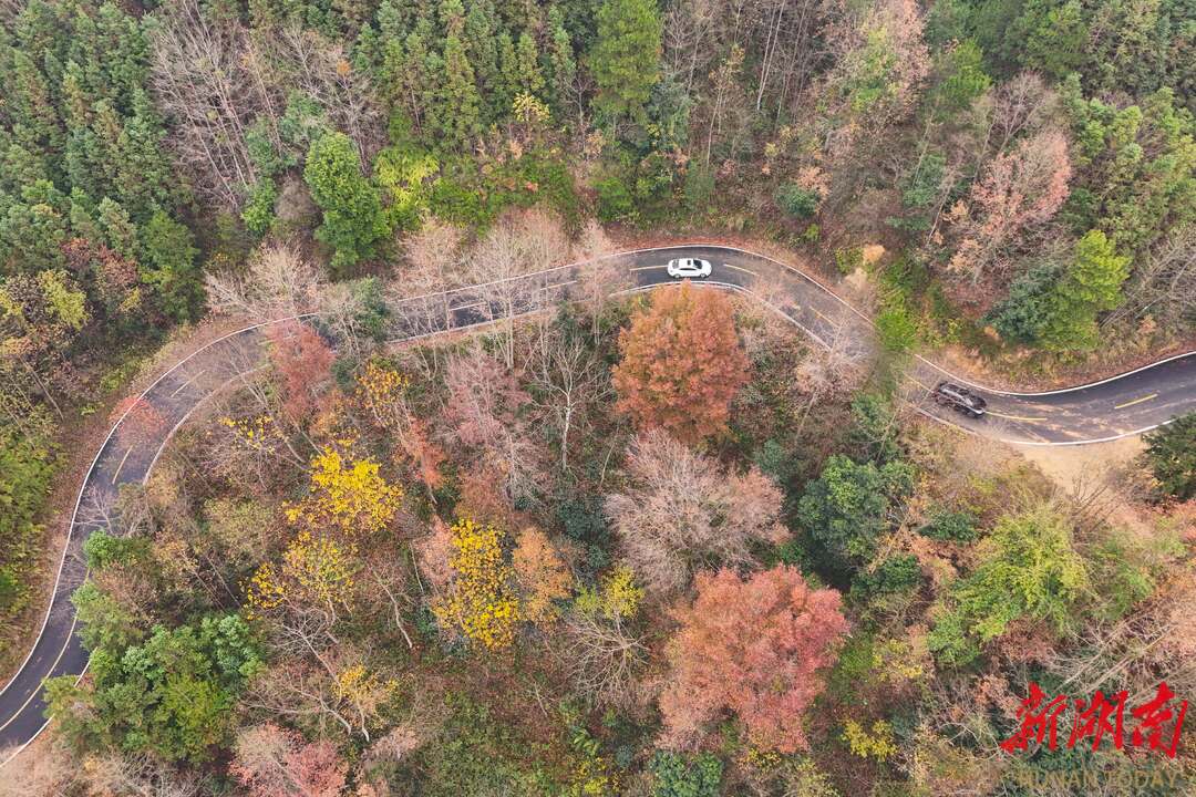 12月22日,通道侗族自治县菁芜洲镇953乡道,公路两边树木色彩斑斓,景色如画。