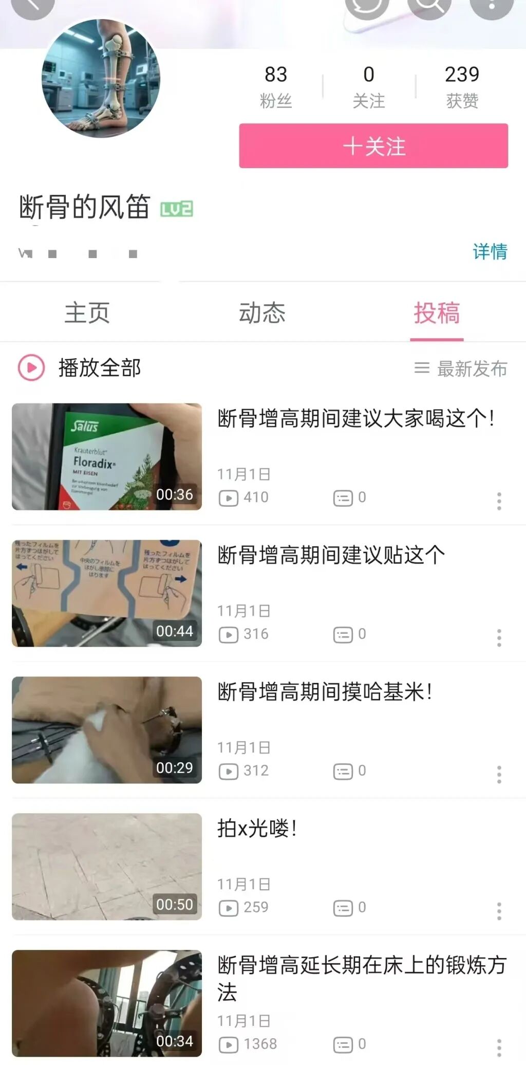 抖音上相关用户分享“断骨增高”手术后恢复记录的相关主页(截图)