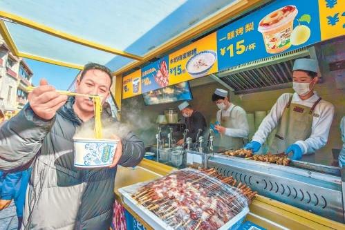 “往年到了冬天,主街上人还稍多些,后街就很一般,天黑后就差不多准备收摊了。”后街一家卖冰糖葫芦、驴打滚等小吃的摊主说,“现在亮化做得好,活动多,晚上八九点还有顾客。”一个不起眼的青海酸奶摊位上,摊主说,10元一瓶的酸奶,最多的时候一天能卖出1万多元。