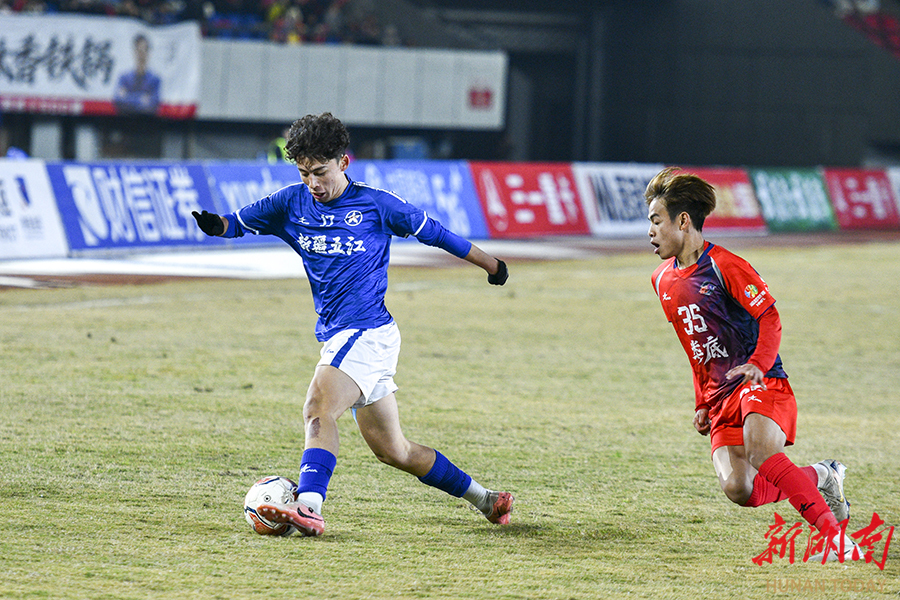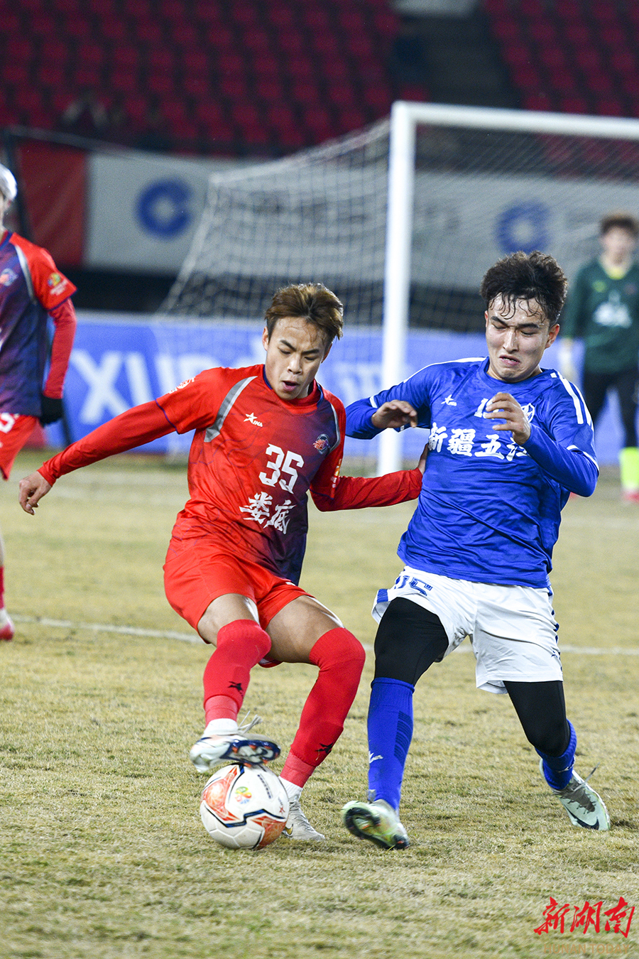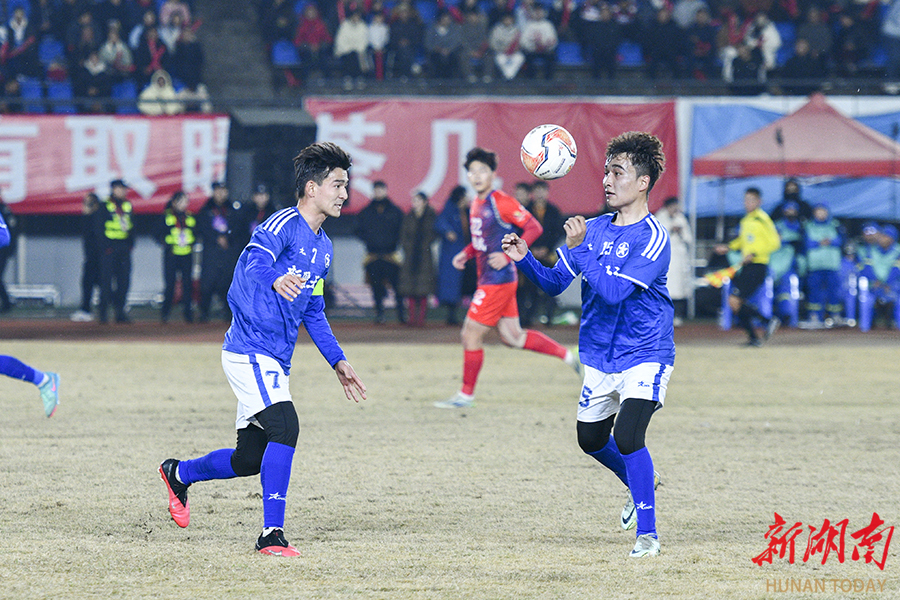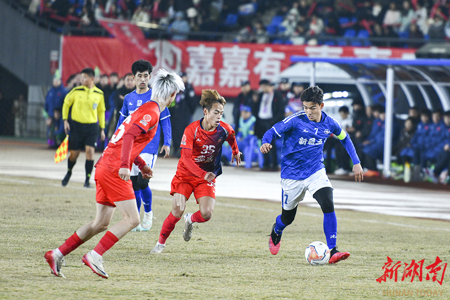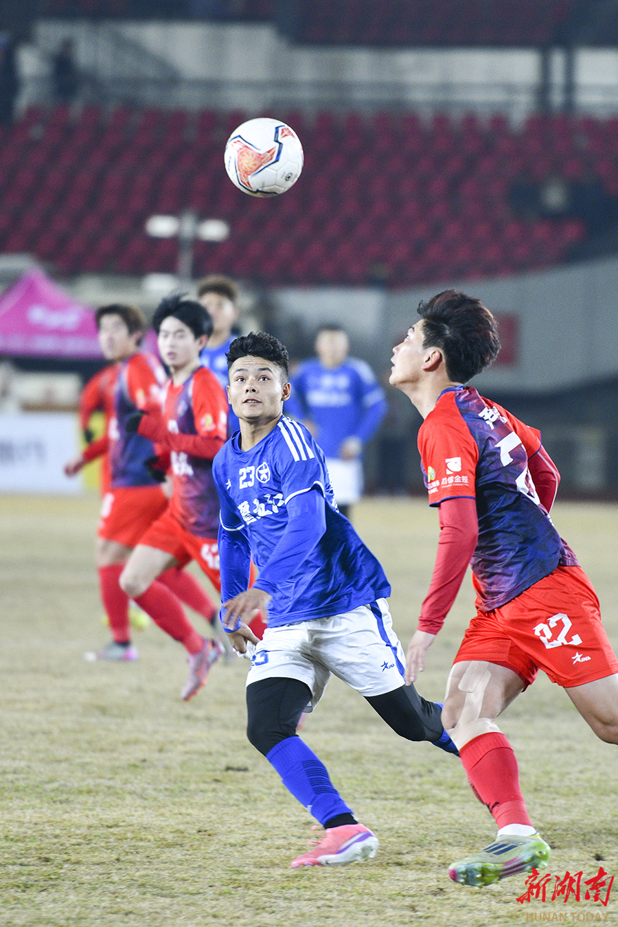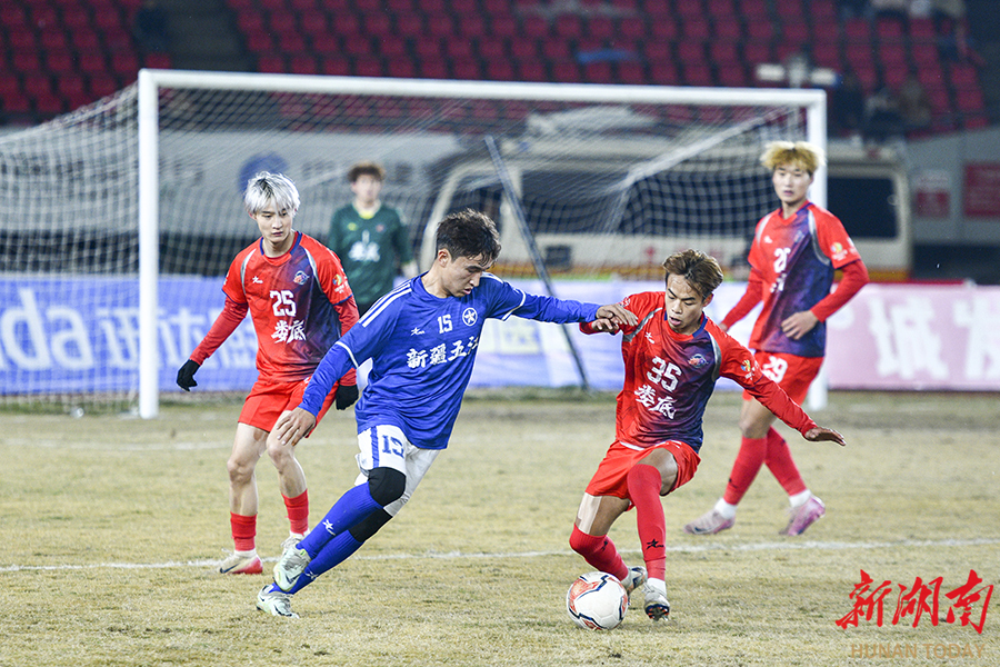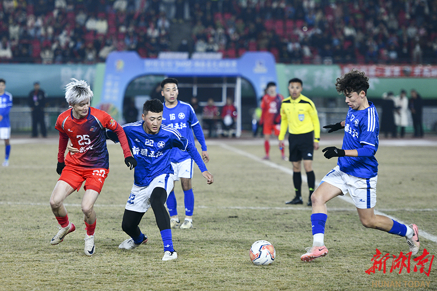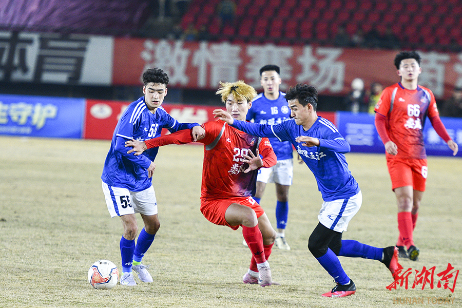12月23日晚,双方队员在激烈拼抢。当天,吐鲁番队(蓝)与娄底队的“湘超”友谊赛激情开赛,这也是娄底队本赛季“湘超”最后一场正式比赛。比赛中双方你来我往、攻势不断,最终两队以3:3握手言和。 吴永华 摄(湖南图片库)