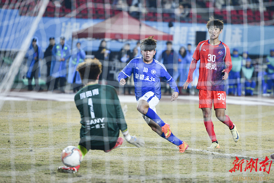 12月23日晚,吐鲁番队球员正在射门。当天,吐鲁番队(蓝)与娄底队的“湘超”友谊赛激情开赛,这也是娄底队本赛季“湘超”最后一场正式比赛。比赛中双方你来我往、攻势不断,最终两队以3:3握手言和。 吴永华 摄(湖南图片库)