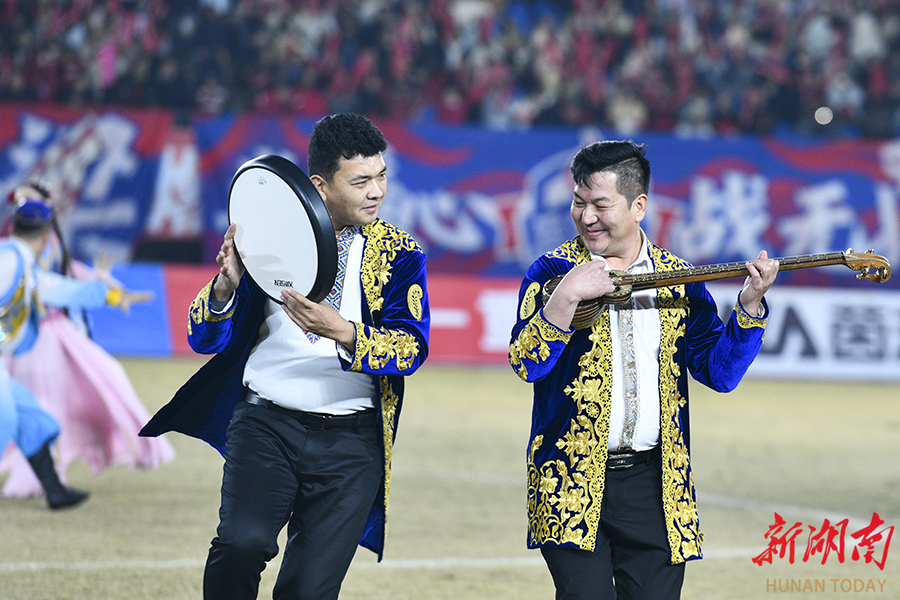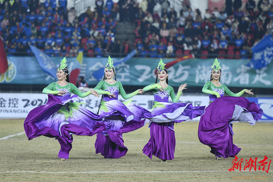 12月23日晚,新疆吐鲁番歌舞剧团带来精彩的文艺节目。当天,吐鲁番队(蓝)与娄底队的“湘超”友谊赛激情开赛,这也是娄底队本赛季“湘超”最后一场正式比赛。比赛中双方你来我往、攻势不断,最终两队以3:3握手言和。 吴永华 摄(湖南图片库)