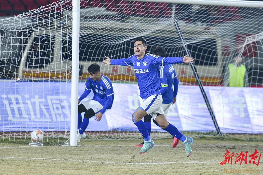 12月23日晚,吐鲁番队球员高兴地欢呼。当天,吐鲁番队(蓝)与娄底队的“湘超”友谊赛激情开赛,这也是娄底队本赛季“湘超”最后一场正式比赛。比赛中双方你来我往、攻势不断,最终两队以3:3握手言和。 吴永华 摄(湖南图片库)