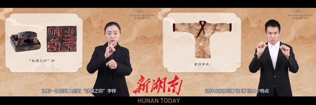 如今,登录“湖南省博物馆”微信小程序,便可以在首页的《手语解读》栏目观看“长沙马王堆汉墓陈列”手语导览视频和部分其他文物的手语导览视频。惊世发掘、“利苍”玉印、素纱单衣……重要内容及重点文物等,都在视频中通过图片、文字、手语并茂的方式呈现出来。