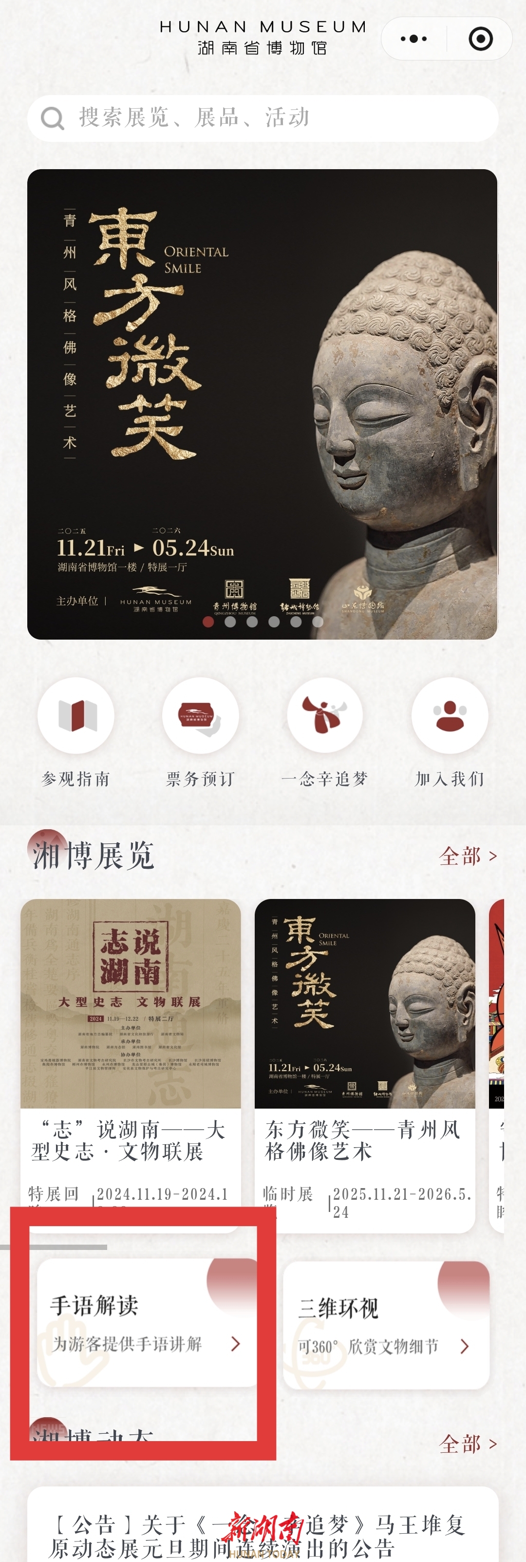 此外,除了“长沙马王堆汉墓基本陈列”已有手语导览视频外,2026年,湖南省博物馆将启动两大基本陈列中的另一大基本陈列“湖南人——三湘历史文化陈列”手语导览视频的研发制作,邀请专业手语老师出镜、专业配音员配音,结合生动的画面,让更多听障人士了解灿烂的湖湘文明。