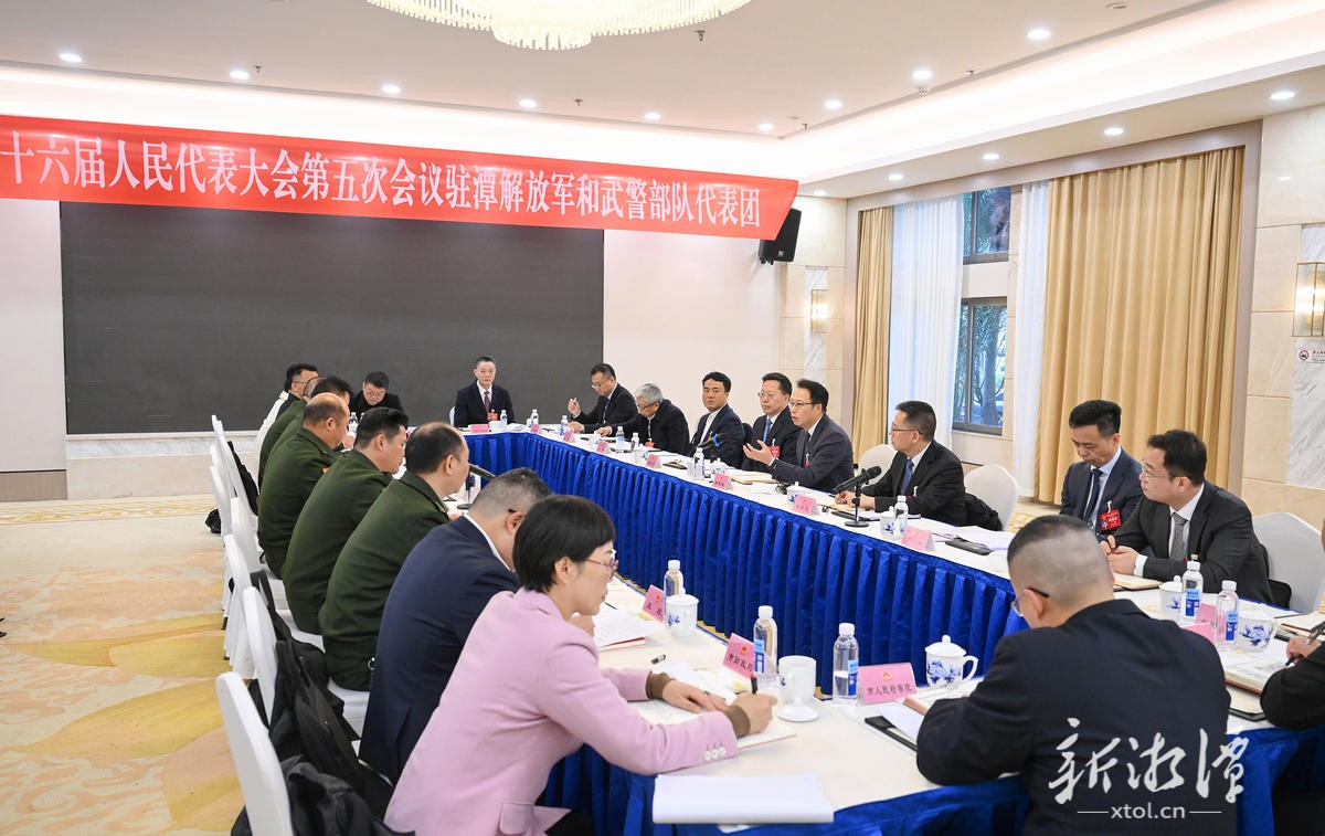胡贺波、李永亮在驻潭解放军和武警部队代表团与代表们深入交流讨论,听取意见建议。(方阳 摄)